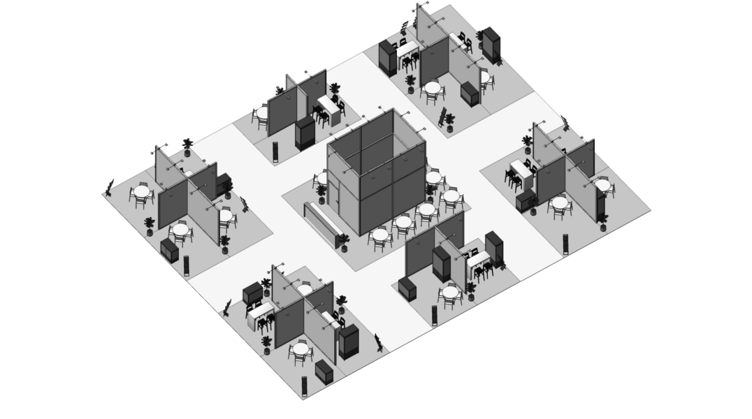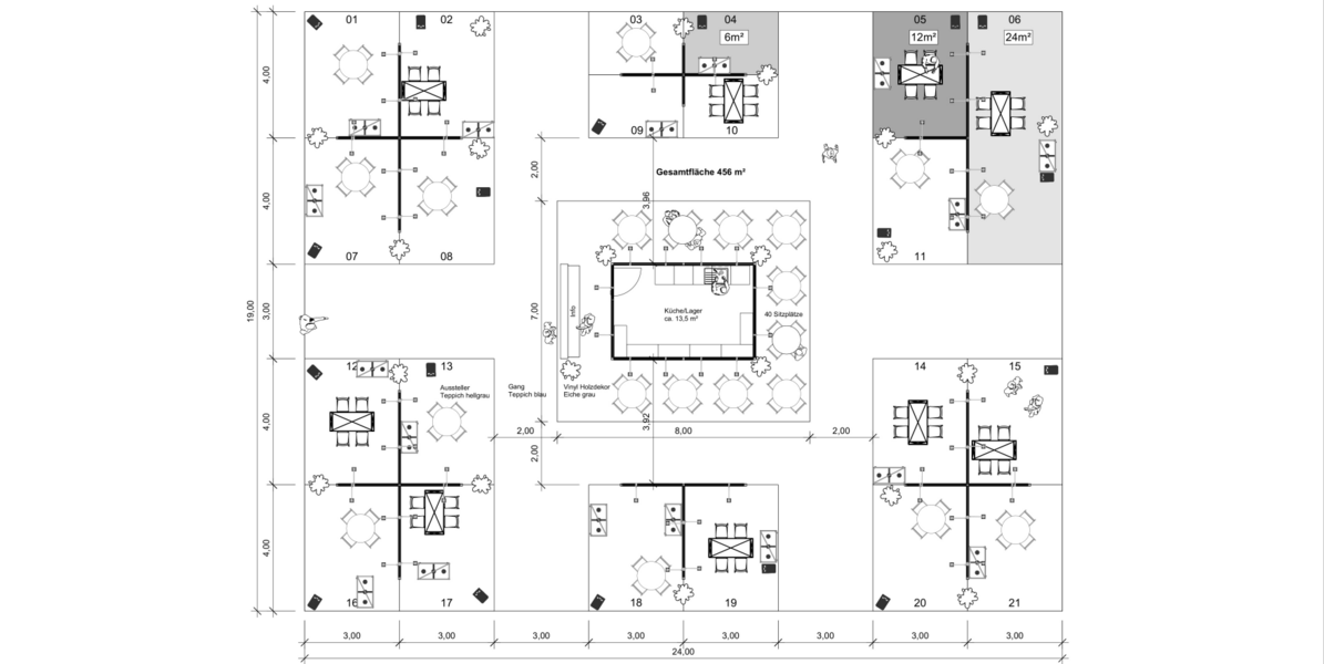 Dabei bieten wir drei Standgrößen an: 6 qm, 12 qm und 24 qm. Je nach Kojengröße ist die abgebildete Möblierung bereits inkludiert. Jede Koje enthält einen Stromanschluss. In der Mitte befindet sich die Gemeinschaftsfläche mit Infotheke, Sitzmöglichkeiten, Lagerraum, Garderobe und Küche.