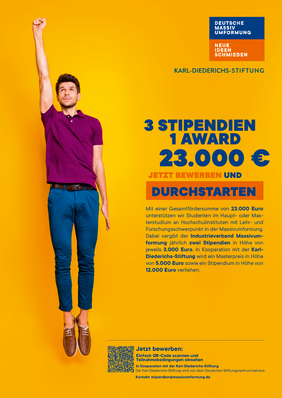 Dabei vergibt der Industrieverband Massivumformung mit dem IMU-Stipendium jährlich zwei Stipendien in Höhe von jeweils 3.000 Euro. In Kooperation mit der Karl-Diederichs-Stiftung wird ein Stipendium in Höhe von 12.000 Euro sowie ein Masterpreis in Höhe von 5.000 Euro verliehen.