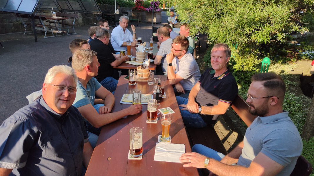 Nach einem Ortswechsel nach Oelde kamen wir dann zum abendlichen Treffen in einem Brauhaus zusammen und profitierten von der Möglichkeit, statt des reservierten Tisches im Innenraum, wettergemäß auf den Biergarten umdisponieren zu können. Das bereits gesehene und das am kommenden Tag anstehende wurde ebenso diskutiert, wie die Planung der Sitzungsorte für die kommenden beiden Treffen. Aber auch der private Austausch kam nicht zu kurz.