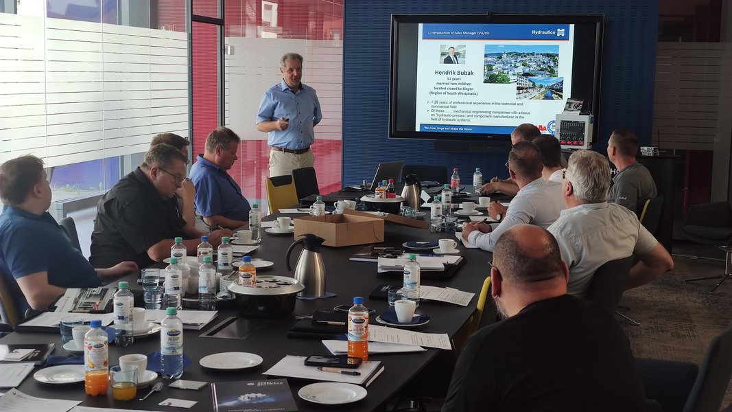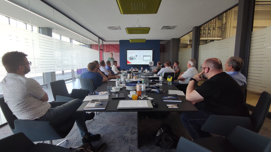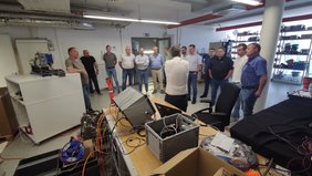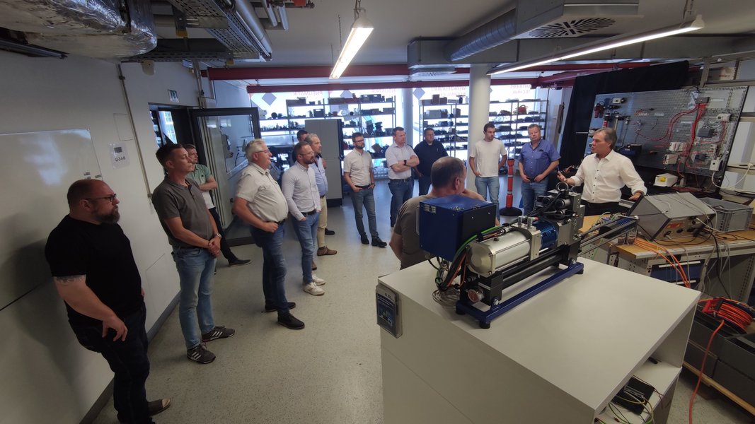 Am nächsten Morgen ging es dann im Hause Nölle + Nordhorn in Gütersloh weiter, wo nach Begrüßung durch Geschäftsführer Rolf Nölle, der Unternehmensvorstellung, einem Fachvortrag zu einem autarken, hydraulischer Zylinderantrieb (durch Herrn Andreas Dejok) sowie einem weiteren zur vorausschauenden Instandhaltung mit "DiMeES" (Digitales-Messdaten-Erfassungs-System – durch Herrn Richard Braun) auch eine Betriebsrundgang erfolgte, bei dem sowohl die "Autarke Achse" als auch DiMeES live zu erleben waren. Spätestens jetzt war allen klar, dass es sich hier nicht nur um einen Händler mannigfaltiger Industriebedarfe handelt, der mit einer beeindruckenden Lagerhaltung punktet.