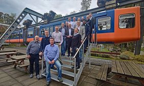 Nach einem abschließenden Gruppenfoto vor einem Ausstellungsexemplar der Schwebebahn auf dem Werksgelände fand in der Kantine (ehemals war das Gebäude die Schmiede) das Mittagessen statt.