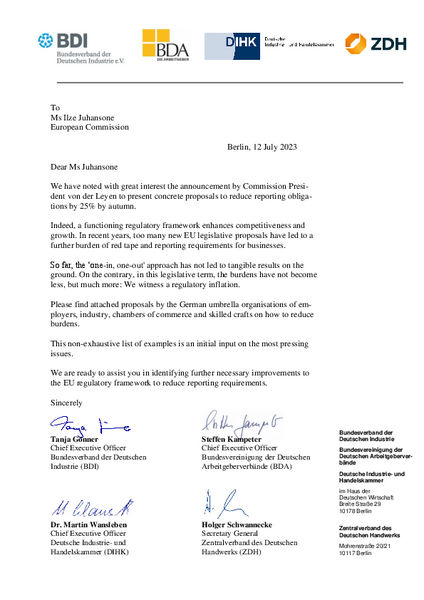 Der BDI hat sich im Rahmen einer gemeinsamen Initiative mit BDA, DIHK und ZDH für eine Verringerung von Berichtspflichten eingesetzt, die aus EU-Recht resultieren. Das gemeinsame Schreiben mit der dazugehörigen Anlage, in welcher die bürokratischen Belastungen und konkrete Entlastungsvorschläge enthalten sind finden Sie nachstehend.
