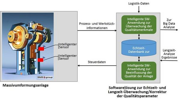 Das Institut für Automatisierungstechnik und Softwaresysteme (IAS) der Universität Stuttgart beteiligt sich im Gesamtvorhaben bei der Anforderungsanalyse, der Entwicklung von Konzepten und Methoden der Echtzeitdatenerfassung und durch Implementierung von Softwarelösungen. Der Schwerpunkt liegt hierbei auf der Erfassung und Bereitstellung von Echtzeitdaten sowie die Rückführung von Steuerdaten zur Erhöhung der Qualität in Massivumformungsprozessen. Das Hauptaugenmerk des IAS liegt auf der logistischen Steuerung und Rückverfolgbarkeit von "kleinstmöglichen Teilmengen" eines gesamten Fertigungsloses in der Massivumformung. Bei der Datenerfassung wird der, am IAS entwickelte, Ansatz "Konnektoren" verwendet, um die Prozessdaten auf einheitliche Weise bereitzustellen.
